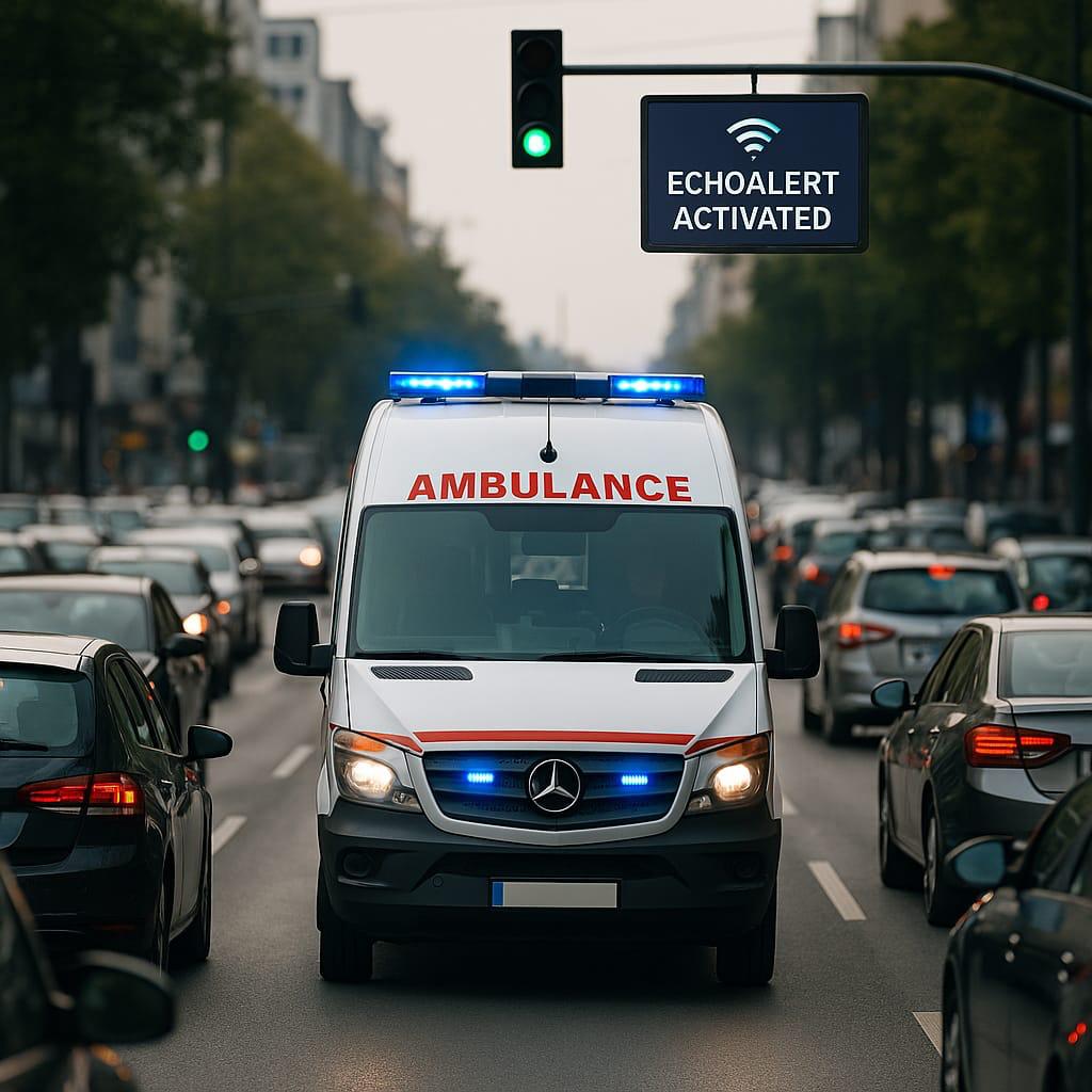 EchoAlert improves emergency vehicle navigation by providing real-time green-light paths on congested roads.